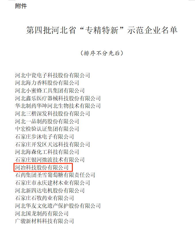 2021年12月30日,河北省工業(yè)和信息化廳發(fā)布了《關(guān)于公布第四批河北省“專精特新”示范企業(yè)的通知》(冀工信企業(yè)函〔2021〕1029號(hào))。通過前期申報(bào),河冶科技股份有限公司通過了市級(jí)、省級(jí)的嚴(yán)格審核,被認(rèn)定為河北省“專精特新”示范企業(yè)。